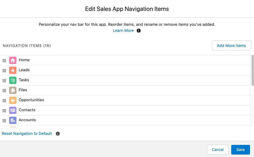 - Add Favorites: To add items to your navigation bar, click Add More Items. Search through your favorites or all available items in your org, and choose what to add. After you make your selections, you can reorder or remove items before saving your changes.