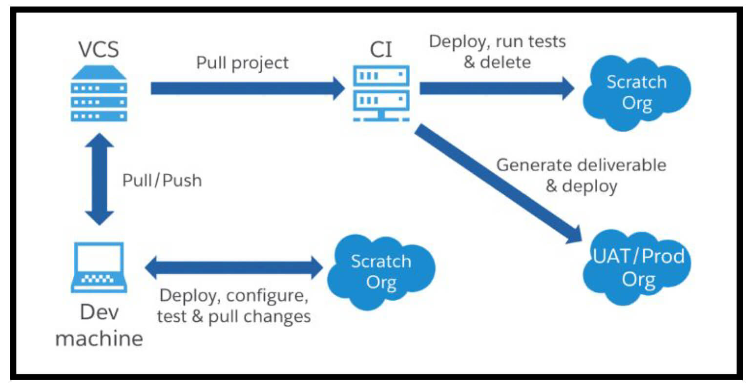 The production org is the source of configuration, customizations, and truth for the code. All the releases and updates are developed with a deployment that is scoped to the production org. It makes sure that the team is familiar with all the technologies and lifecycle involved. But it can make it difficult for the team to coordinate efficiently as the model does not offer continuous integration. It does not have agile methodology making it difficult to roll-back releases and automate testing.
