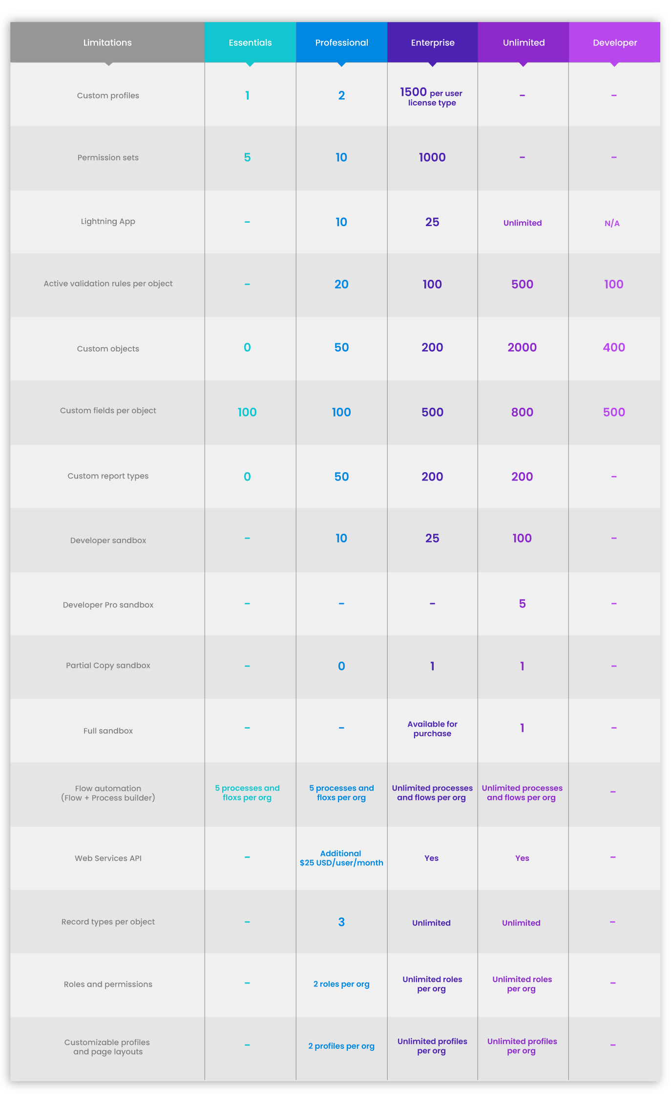 - An unlimited number of user profiles, roles and permissions, page layouts, and record types per object.