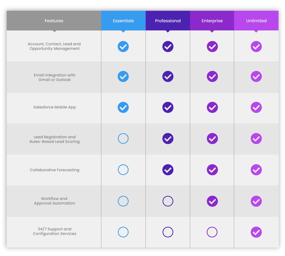 Salesforce offers 5 editions: Essentials, Professional, Enterprise, Unlimited, and Developer. They have similarities but differ in functionality and price. Generally, businesses start by adopting the basic edition (Essentials) and, as they diversify, they assume advanced editions that contain features of the previous ones and include new functionalities.