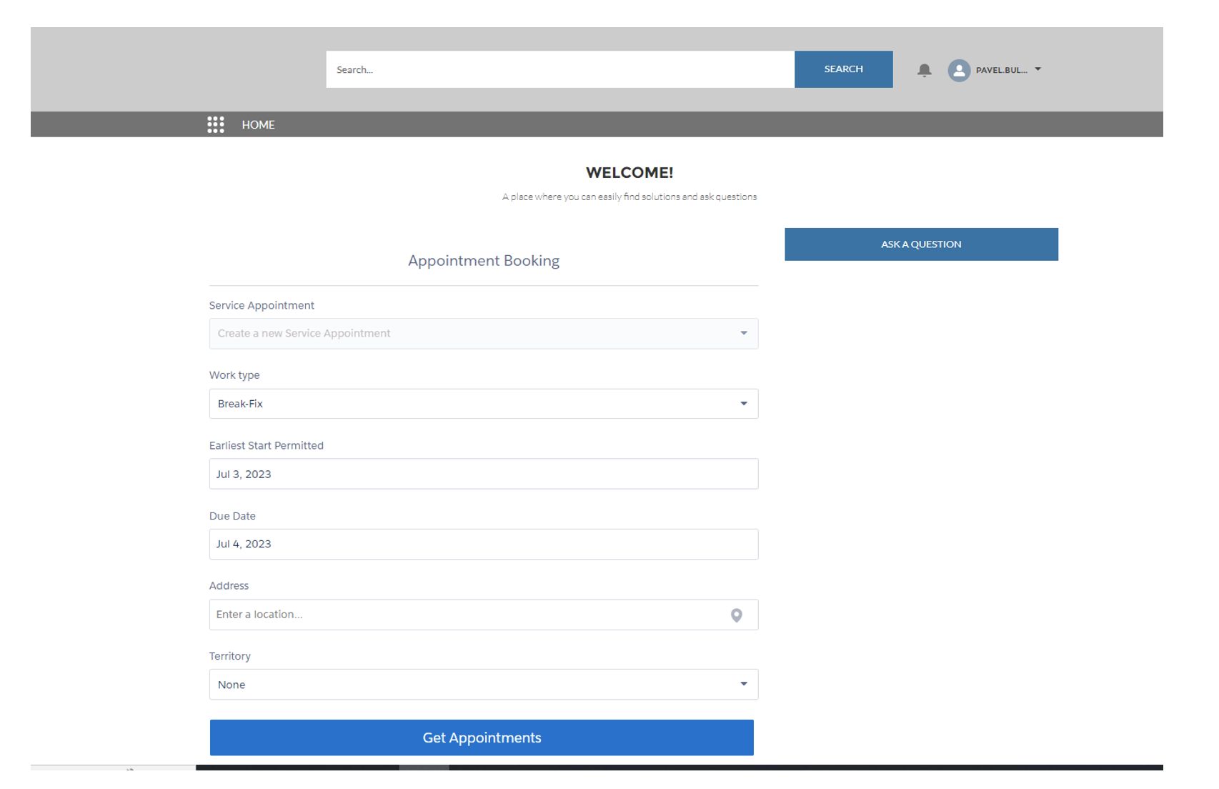 Voila! The client can now choose a date, a time slot, a territory, an address on his side and the system will find a suitable technician to assign for the job. However, it still requires to create a proper work order for the client.