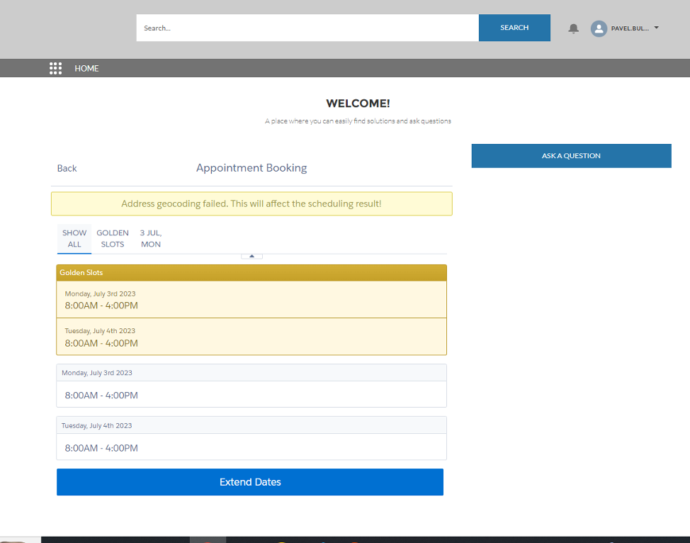 During the process of booking an appointment, client can choose a work type, the earliest start and a due date, an appointment address and a working territory of the field worker. After the client enters all necessary data, the component will provide the client with time slots when the field worker who fits the work requirement is free. Time slots can have different categories like ‘recommended’, ‘gold’, ‘silver’, and etc.