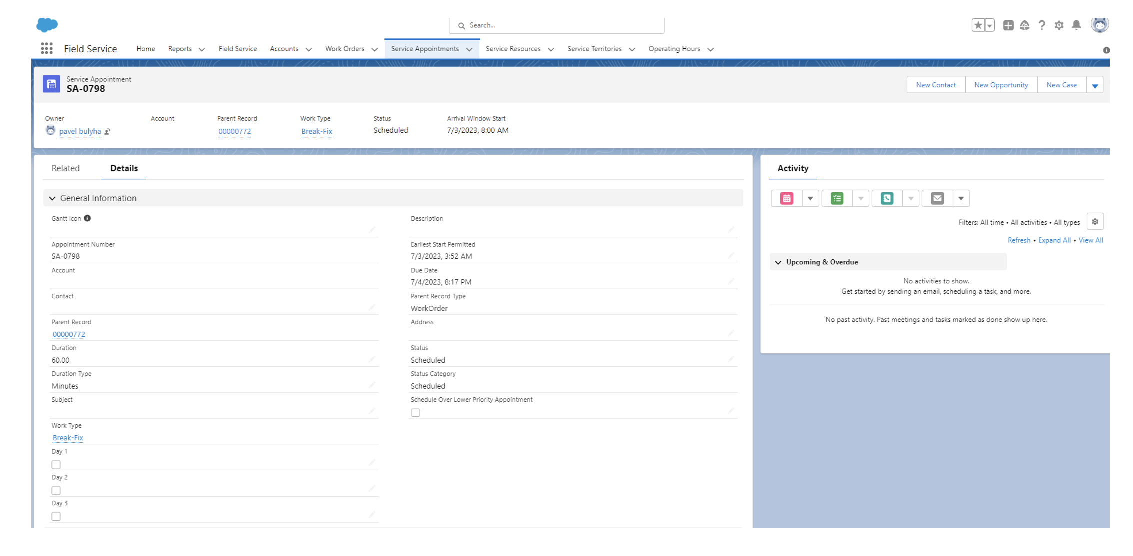 Every field operation is represented by 2 objects: Work Order and Service Appointment. Work Order is a material side of the field work: what kind of work it is, what products it needs, what skills this work requires, and etc. Service appointment – organizational side of the field work: