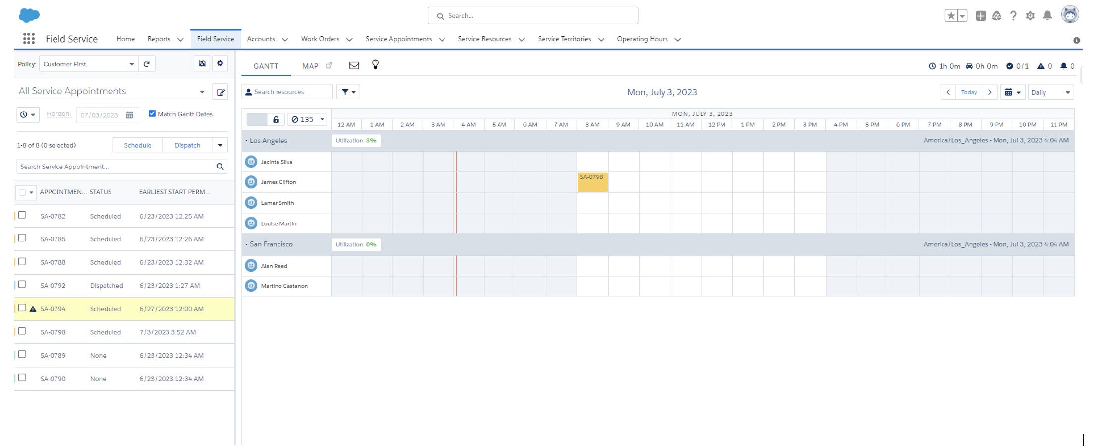 After the client accepts creation of the service appointment, system will search a technician who is free at the selected appointment time gap, has required skills and qualified enough to do the job. In our situation this technician is James Clifton.