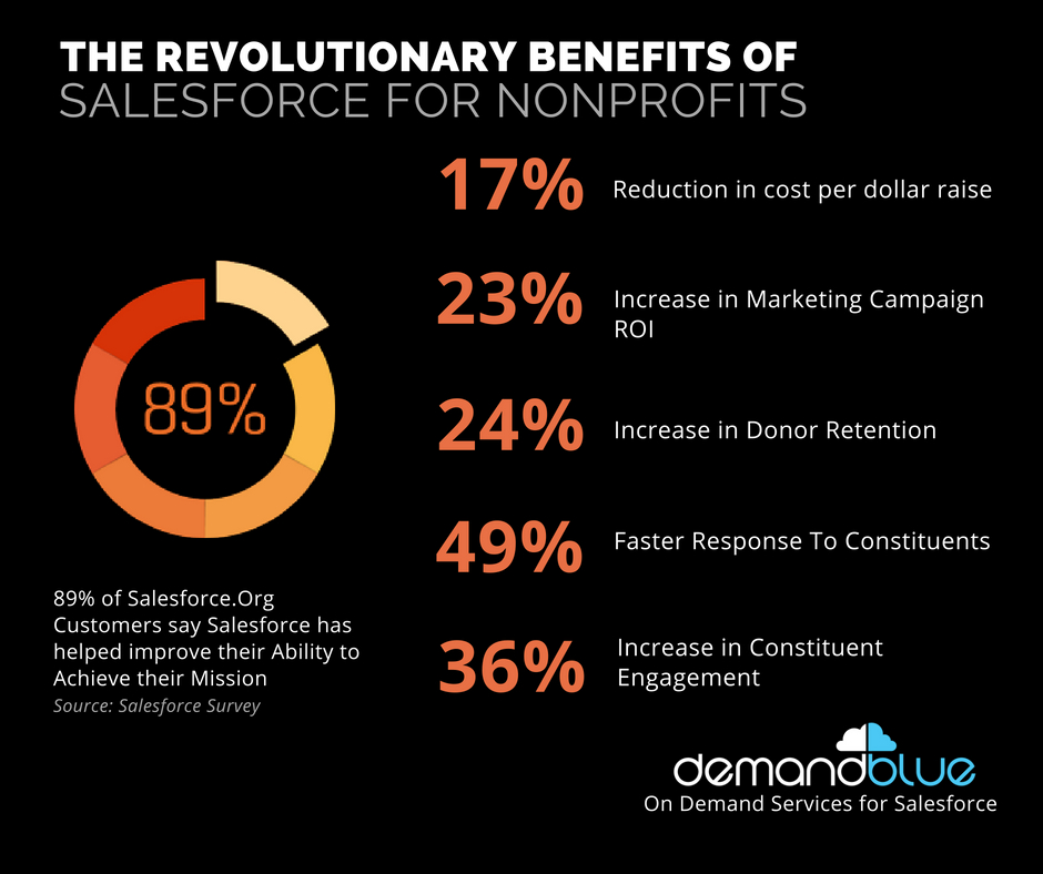 22% increase in funds raised 17% increase in constituent retention, 23% increase in constituent engagement, 52% improvement in operational effectiveness, 70% improvement in data quality that 91% would recommend Salesforce to other Nonprofits