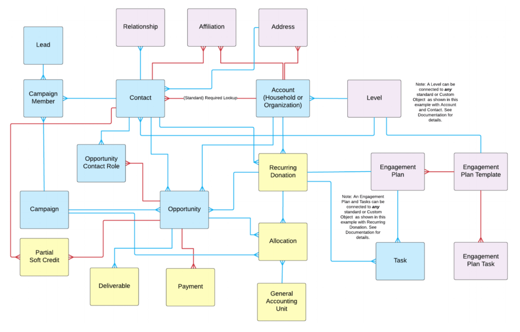 Below is a data architecture of how the Salesforce Nonprofit Success Pack works. Blue represents Salesforce CRM Objects, Yellow the Fundraising and Pink is Relationships and engagement.