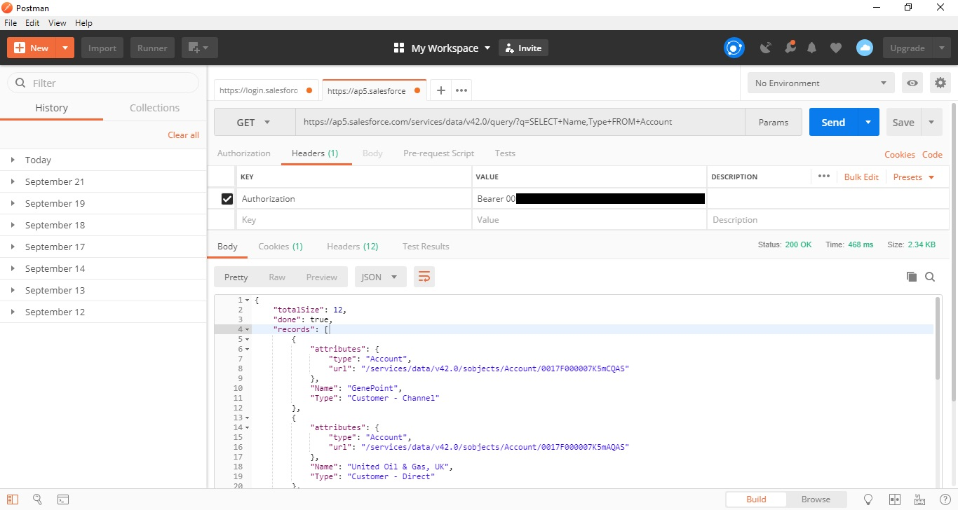 Programming interface adaptations are ceaselessly overhauled, I am utilizing v42.0 and a basic inquiry for example SELECT Name, Type FROM Account. This will be a GET demand and in the header, I'll set the key:- Authorization and Value:- Bearer as we have the entrance token kind of carrier (from the past JSON reaction).