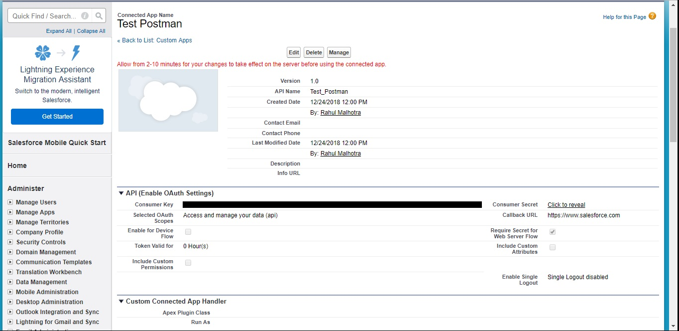 This is very like when we make an associated application at any outsider worker which is utilized for a worker to worker correspondence, as we will utilize mailman so the Callback URL doesn't influence us. You can compose any URL there. It is essentially the URL where the approval code will be sent if there should be an occurrence of OAuth. I have utilized https://www.salesforce.com