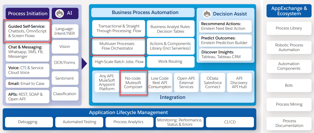 - Business Process Automation – You could simplify, automate business process and workflows using Salesforce Flow, MuleSoft Composer, or Flow Orchestrator.