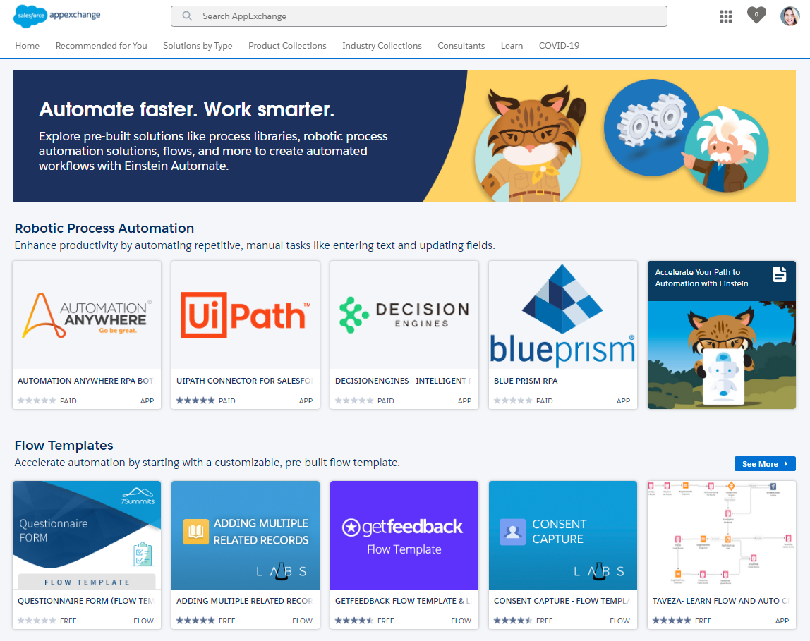 - AppExchange – Install flow automation, partner templates, RPAs from the AppExchange portal and get started with an automation process.
