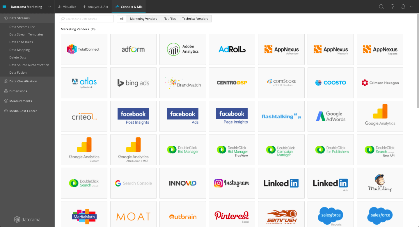 Datorama's APIs cover the most crucial marketing and advertising data sources: social media, email, Google Analytics, CRM data, etc.