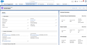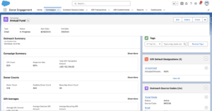 Campaigns. Campaigns are the usual object for tracking outreach efforts in Salesforce; however, fundraising in Nonprofit Cloud organizes things a bit differently. Instead of campaigns in hierarchies and campaign members, engagement tracks appeals and audience as outreach source code records. Outreach source codes give engagement more granular control over comparing performance across messages, channels, and segments.