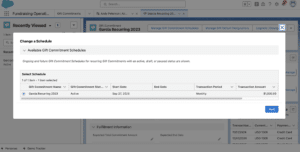Gift Commitments and Transactions. Nonprofit Cloud allows fundraisers to track the promise of donations as gift commitments and actual donations as gift transactions. This distinction makes it easy to separate forecasting from realized funds and provides an easy means for operations to follow up on missed or failed transactions. Commitments can be configured as one-time or recurring.