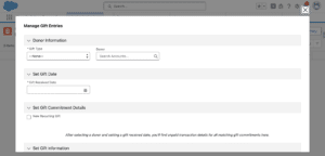 Gift Entry & Batches. Operations can efficiently enter gifts using Gift Entry and Gift Batches. Gift Entry allows fundraisers to enter multiple donations on one screen that will split out into gift commitments, transactions and other records, and a gift batch is just a collection of gift entries that are processed together.