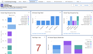 Reports & Dashboards. A cornerstone of any Salesforce implementation, reports and dashboards help organizations surface their data in meaningful ways to help team members make informed decisions. Salesforce Nonprofit Cloud can report on all kinds of key metrics that empower your team members with a high-level understanding of your fundraising data, including opportunities, gift commitments, donor touchpoints, interest tag usage, etc.