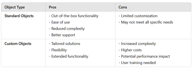 In many cases, a combination of both standard and custom objects might be the best approach. Start with standard objects and only create custom objects when necessary to address unique business needs. This balanced approach helps maintain a streamlined and efficient Salesforce environment.