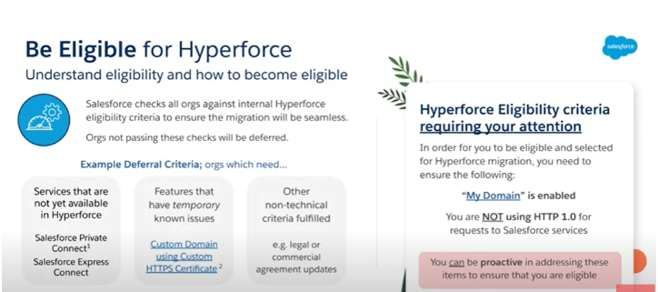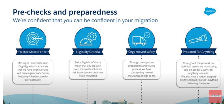 Salesforce runs eligibility criteria check on org before migration, in order that migration would be a seamless method. we have a tendency to run these checks internally supported your Salesforce usage and use the knowledge to visualize whether or not the org is prepared for migration onto Hyperforce. A number of these checks involve distinguishing orgs that square measure exploitation explicit services or options that square measure presently not obtainable on hyperforce and hold these orgs faraway from migration.