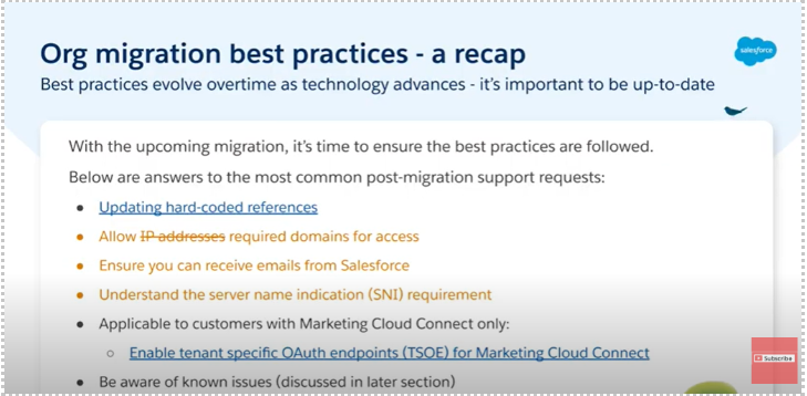 (NOTE: My Domain is needed for purchasers that have requested the org migration.), and if you have got any hard-coded references (for example, na1.salesforce.com) confirm that you simply update them to relative URLs (for example, login.salesforce.com or your My Domain subdomain) before the org migration.