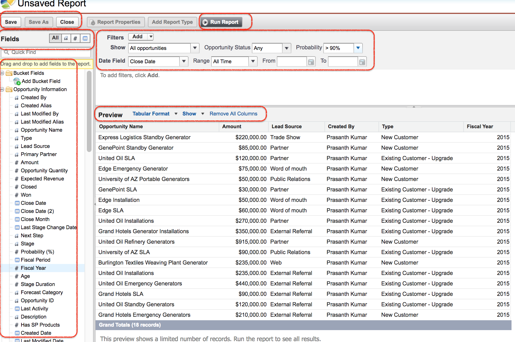 Using Salesforce Report Builder, we have a variety of options for creating reports. As illustrated above, there is a left narrow segment and a right wide section.