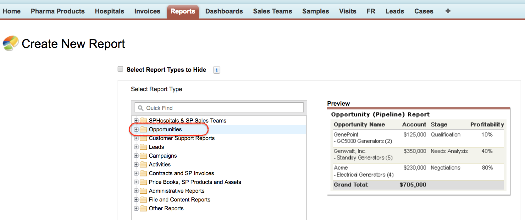 We can use standard reports and also generate unique reports based on our requirements. After choosing a new report, the first step is to choose a report type. What is a report type, exactly? The link between a primary object and its related object is defined by the report type. There are two types of report types: standard and custom. The aforementioned reports are Standard report kinds. We'll build reports using Opportunities in this Salesforce tutorial, as illustrated below.