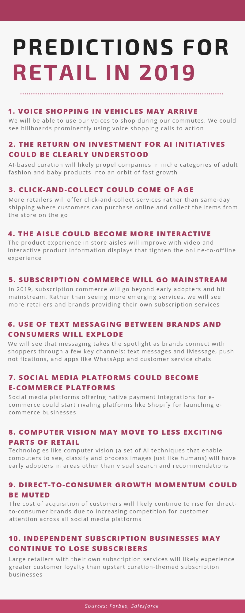 - Leverage Data to Build Seamless Commerce Experiences — The Fourth annual Salesforce predictions for Retail in 2019 indicates that Customer Data and Data integration across enterprise systems will become a strategic imperative in 2019. Maximize Einstein AI features to get a 360-view of your customer data to make better decisions and deliver personalized shopping experiences through Salesforce Retail specific features.