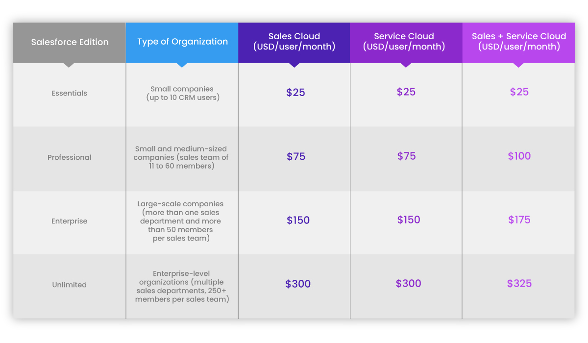 To make your choice, you will need to consider the price of each product and the Salesforce edition that best suits your needs. We have made the following summary that will be of great use to you.