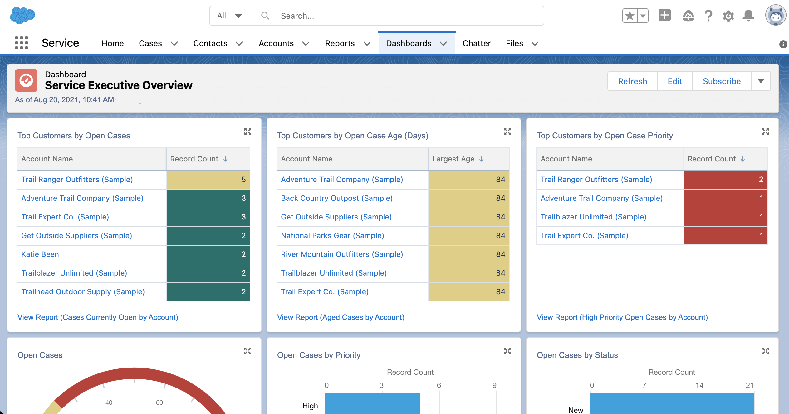 Service Cloud support reports and dashboards give supervisors a comprehensive picture of their service team's output and can highlight opportunities for process improvement. Reports can track statistics such as the number of cases created, case comments, emails, case owners, contact roles, response time, and any other important case data. Dashboards allow you to visualize report data and can give you an at-a-glance service health check.