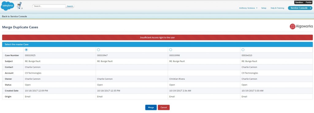 Case Merge - "Insufficient Access right to the user" error
