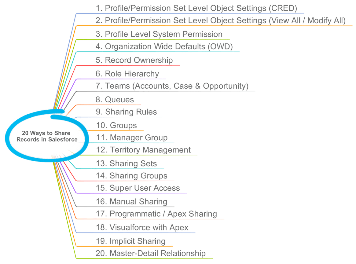 If the Organization Wide Settings (OWD)  in your Salesforce Org is set to anything other than “Public Read/Write” for any of the standard or custom objects then it is more than likely that you will need to setup some sharing rules to share these records with other users. So what are the different ways to share records? Here is a checklist of all the different ways (20 that I could think of) in which you can share records in Salesforce. You can use this as a quick reference guide to help you determine which of these options will be most appropriate to meet your business requirements.