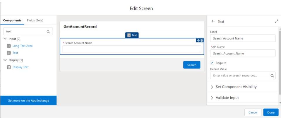 - To display the Information, select Display Text and give API Name Display_Account_Name. In the resource section, Type Account Name: then click on insert a resource from the drop-down and select Account from Get_Account_Record from Record (Single) Variable then write Name. Example: Account Name: {!Get_Account_Records.Name}.