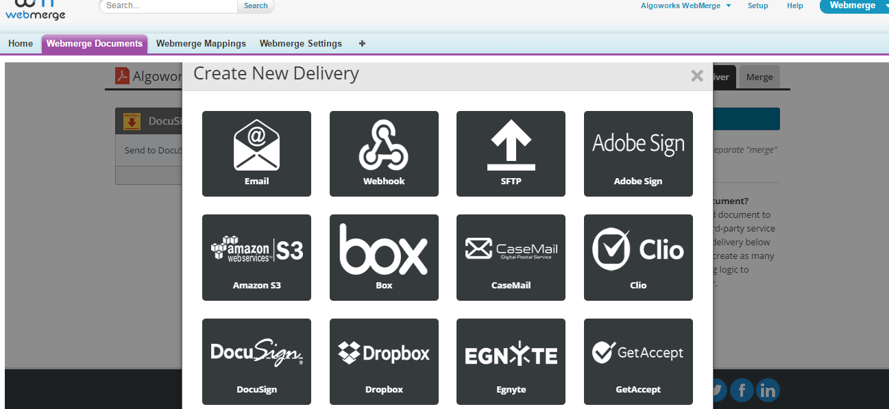 Step 3: Also, setup deliver setting. Click on “+New Delivery” button and choose DocuSign from the list of delivery methods available