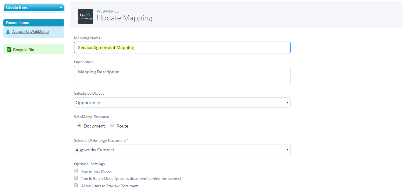 Step 4: Now setup the mapping of the object and the fields by clicking on the tab “WebMerge Mappings” and click on the button “+New WebMerge Mapping”