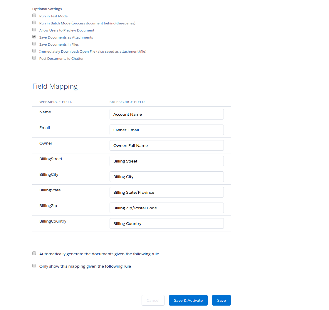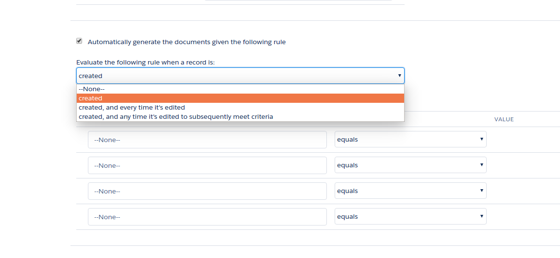 - If you check the “Automatically generate the document”, you can send document in three situations for salesforce object’s record when:-Created - this will evaluate the rule every single time a record is created. If the rule criteria are met, the document will be created.Created, and every time it’s edited - this will evaluate the rule every single time a record is created and every single time the record is edited. If the rule criteria are met, the document will be created.