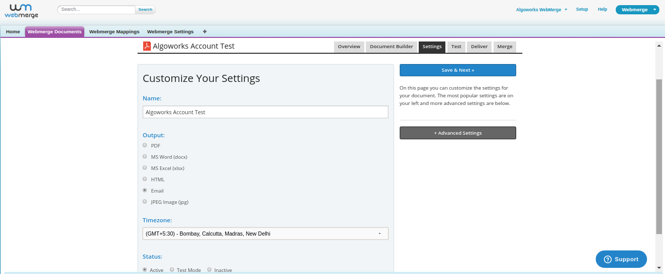 - Under Settings section, Name your document, select Output type, Timezone and Status. And click on Save and Next button.