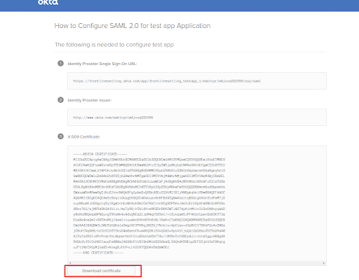 • This will take you to new tab where you will be provided with URLs and Sign On certificate which will be configured in salesforce.
