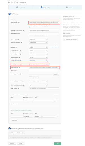 • Now type the URL which you want to redirect after Logging out from Service Provider(Salesforce) in Single Logout URL field. Here we put Identity Provider Single Sign-On URL which we have got from View Setup Instruction tab because after logging out from salesforce it will take us to Okta Login screen and after logging in it will again redirect to salesforce org home page without asking salesforce credentials.