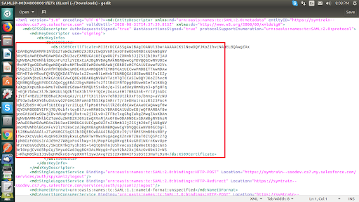 • Open that file and copy the text between ds:X509Certificate and paste it in the notepad between ‘-----BEGIN CERTIFICATE-----’ and ‘-----END CERTIFICATE-----’ as shown in the image :-