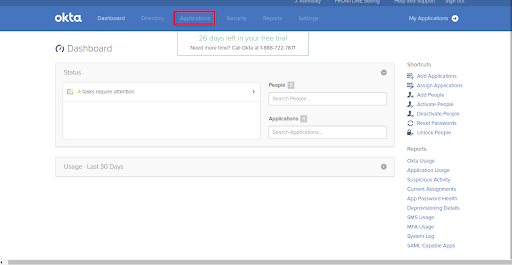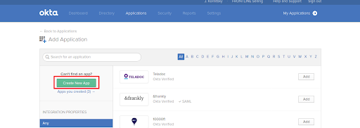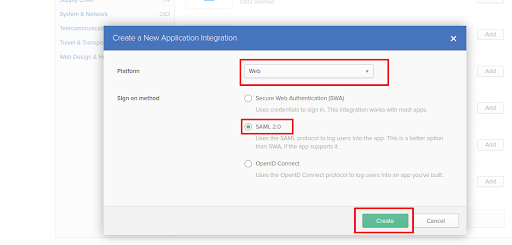 • Then click on Create New App button, this will open a pop up where we select Web for Platform and SAML 2.0 for Sign On Method field then click Create.