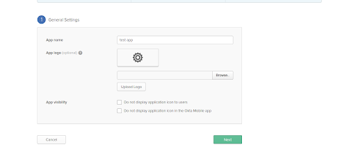 • Give the app name and assign your company logo to it, if you want to restrict users from seeing the app icon then check the first checkbox and if you do not want the app icon visible in okta mobile app then check the second checkbox and then click Next.