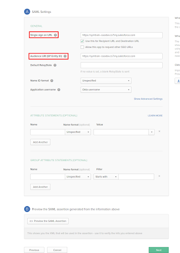 • Here you will configure the SAML setting, for now put your salesforce domain url in Single sign on URL and Audience URI (SP Entity ID). We will come to this setting later after configuring SAML setting at salesforce because from there we will get Single sign on URL, click Next.