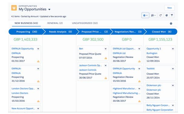 Lightning users do not need to implement Kanban Board separately. The board can be accessed right from inside the CRM and it can be used for the objects like Contracts, Leads, Opportunities and Knowledge Base articles. The objects can be grouped together by the fields, which give it an intuitive display. You can also view alerts, totals and other characteristics of data as well. Theobject displayed on thescreen can also be grouped together by opportunity stage. It is enabled for a number of objects. Following screenshot represents the Kanban view of Opportunity page: