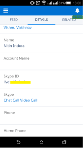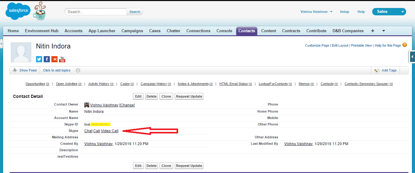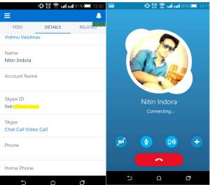 Steps to run: Create or open contact record. Fill required field and Skype ID of this contact. I have created record of Nitin Indora with him Skype ID. Click on Save. You can see formula field with three links. Now you can chat, call and video call with your contact.