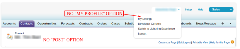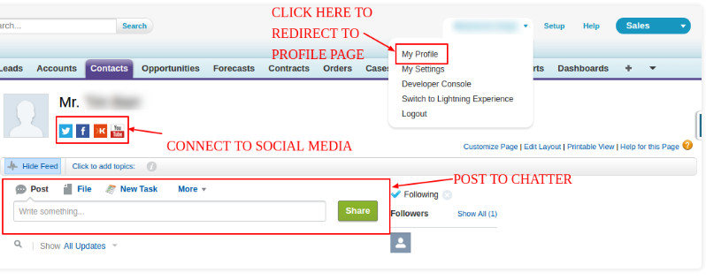 Here we will learn how to enable social media and chatter in Salesforce. Let's start from a contact tab and see how it looks without enabling social media and chatter.