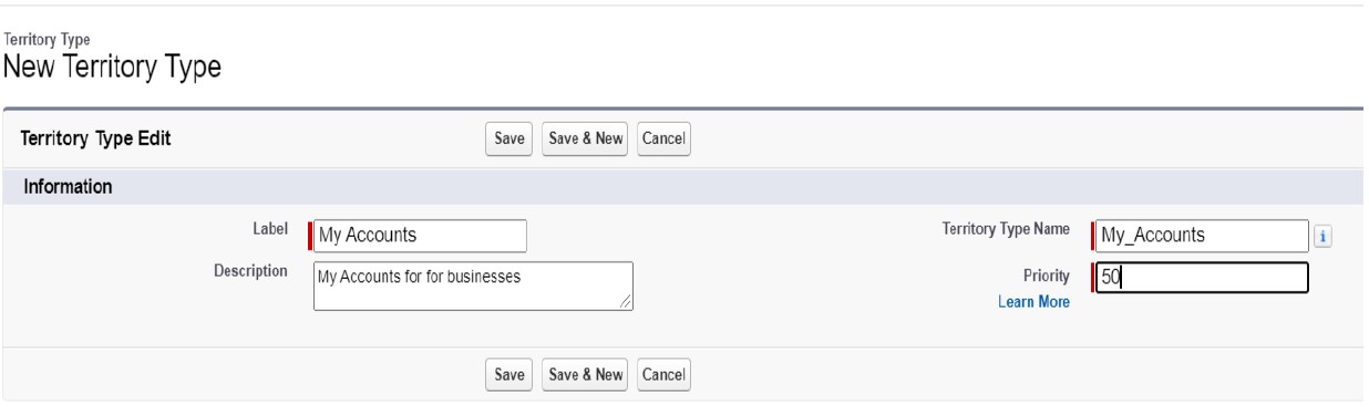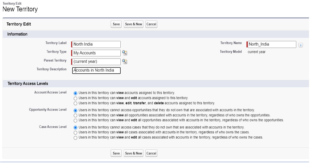 5. On the New Territory page, enter North India in the territory label field and select the My  Accounts in the Territory type field.