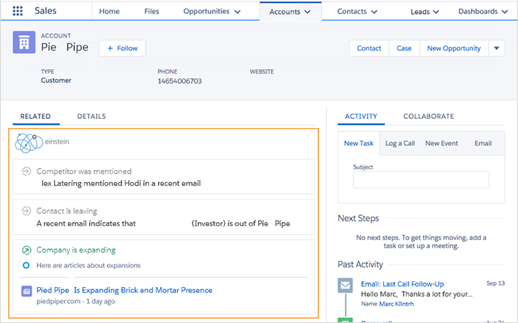 Salesforce Sales Cloud is the world’s no. 1 sales platform. Artificial Intelligence for sales helps in setting up leads and opportunities better. Both leads and opportunities scores analyze the data and tell which opportunity and lead are most likely to convert, and also display factors behind the scores. Salesforce Einstein for sales helps to eliminate the busywork by updating contact records and logging activities. Salesforce Einstein builds the efficiency of salesmen and surveys the exercises to give proposals and knowledge to manage them the correct way.