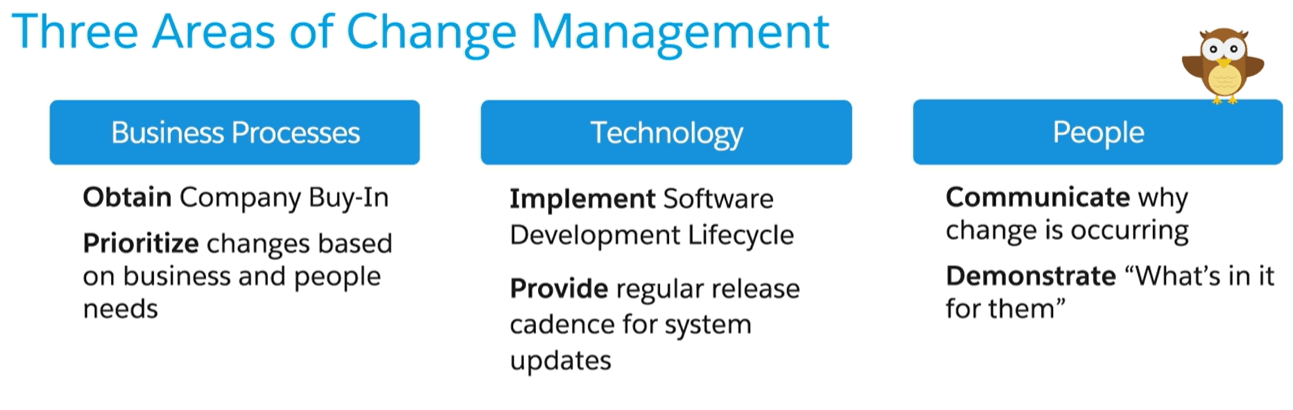 If these three areas are not handled properly, there is a high chance of Salesforce project failure. Often the changes are handled in a reactive manner and not in a proactive fashion.