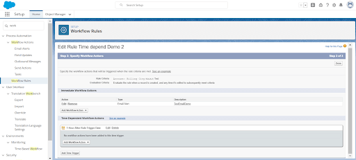Time-Dependent Action: Time-Dependent Action executed at a particular time characterized by you, for example, sending an Email alert following 24 hours of lead creation if the lead isn't reached. At the point when the predefined time passes, the work process rule rethinks to watch that record actually meets the rule criteria.