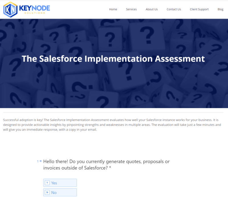 Sound familiar? These are valid questions to have as your business grows and changes. Now, you can be your own Google doctor and try to learn everything yourself. Or, you can choose to get a checkup from a professional. That is why KeyNode Solutions consultants put together a simple Salesforce Implementation Assessment for you. Coming from our experience helping our own clients, we have put together an interactive assessment based on best practices for success. These 10 questions are designed to touch on areas such as security, training, reporting, etc. At the end of the assessment, you will receive a grade and we will email you the results – click here to start.