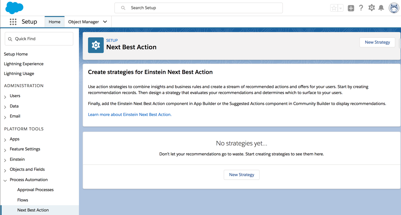 The Einstein Next best action feature in Salesforce Spring ’19 allows you to direct your users to the best next step. This component available on Lightning record pages uses various strategies that apply your organization’s business rules to display context-sensitive content like an upgrade or any other service. You get to define the rules and conditions that determine which recommendations to be displayed to your users. This feature is available as part of Einstein Next Best Action.