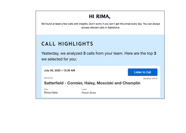 How: Call Highlights emails to have an improved look. The new email format now shows the related rep and prospect, the record type, and other useful details.